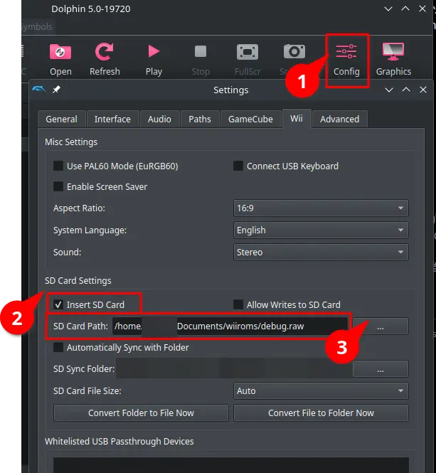 配置したら上の画像のように、dolphinの設定からWiiの設定を開いて、SDカードを挿入にチェックを入れてください。