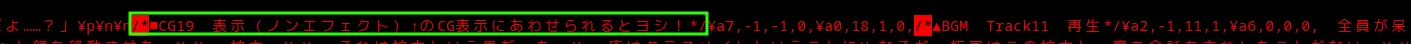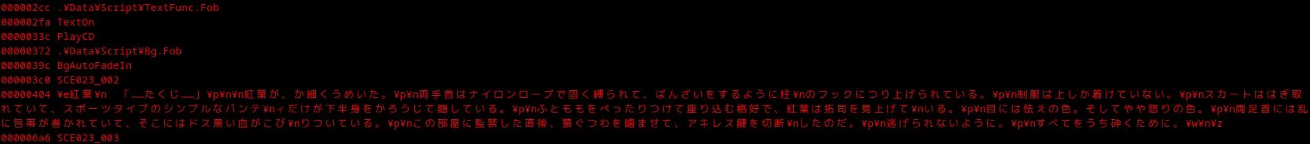 多くの.FOBはシナリオ関連のものであり、テキスト表示やCGの切り替え、SE、BGM再生などが記述されている。