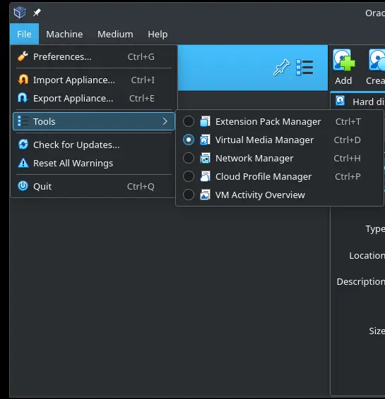 VirtualBoxのメニューからVirtual Media Managerを選択。