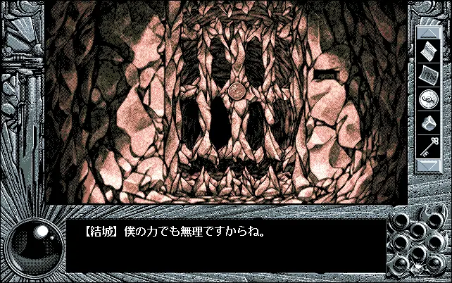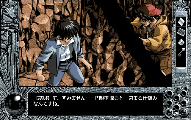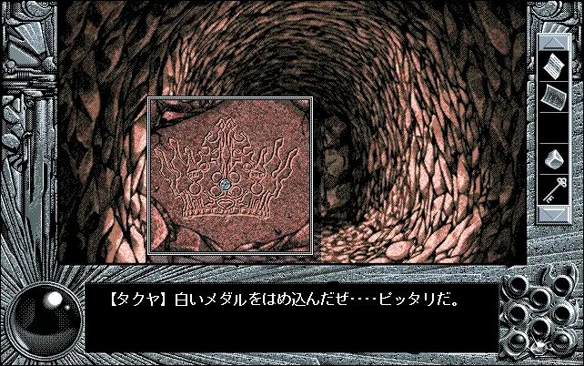 澪ルートの終盤の探検で結城か美月を連れて行く選択肢があり、結城を連れて行くと、石のドアの前の落とし穴に落ちて結城が死亡してしまう。 美月を連れて行った際に、石のドアの中央に、後に手に入る石版をはめると落とし穴が出現しなくなる。 異世界編クリア後に澪のハッピーエンドを見るためには美月を同行させて石版を使う必要があるのだが、結城を同行させて石版を使うと結城の死亡は回避できるのだろうか? と疑問に思ったので検証しておくことにした。 ドアに円盤をはめて…