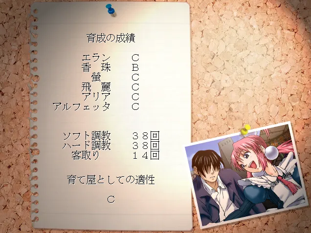 4, 5人教育してゲーム終了となるが最後にお金を60万以上持っていると買い物イベントで隠し(?)ヒロインルートを見ることができる。